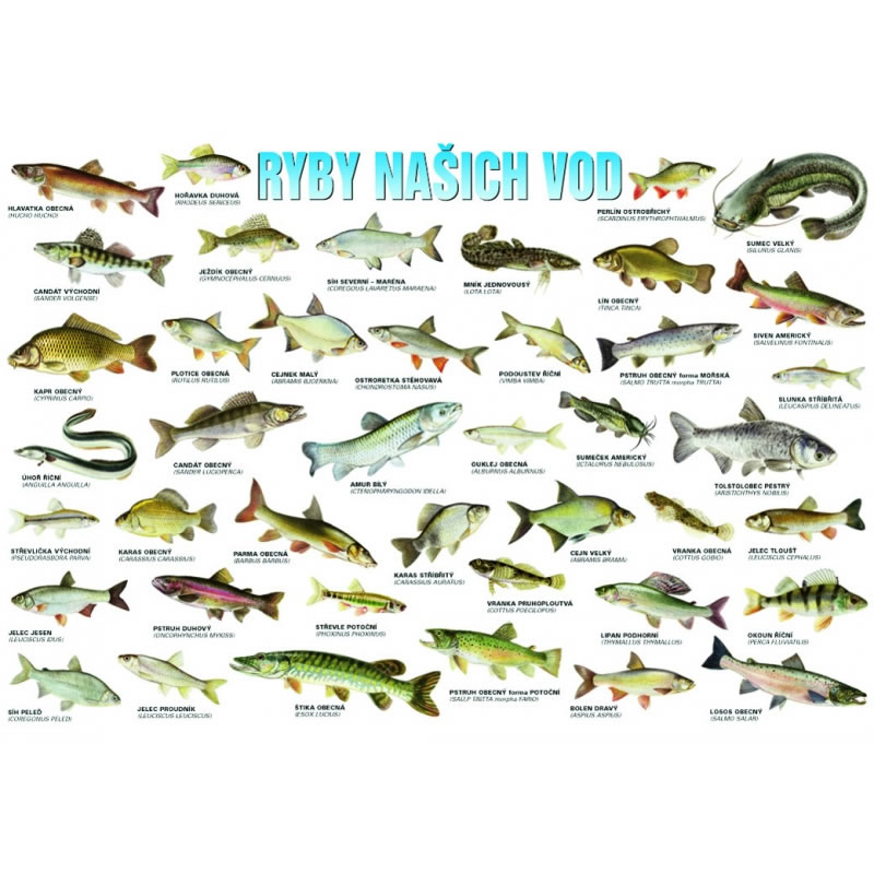 Výukový plakát Ryby našich vod ve formátu A3 (29,7×42 cm), jednostranný, plnobarevný. Obrázky ryb našich vod od ak. malíře Květoslava Híska s jejich druhovým názvem v Čj a latinským názvem.