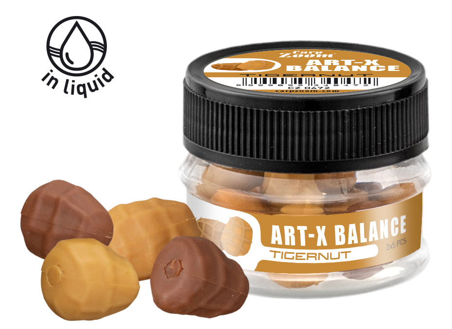 Realistická imitace tygřích ořechů v "balance" provedení (vyvážená nástraha). Balení obsahuje 10 ks (5 světlých, 5 tmavých) naložených v aromatickém dipu s příchutí tygřího ořechu. Ideální jako pohotovostní nástraha nebo pro kombinaci s pravým ořechem či boilies.