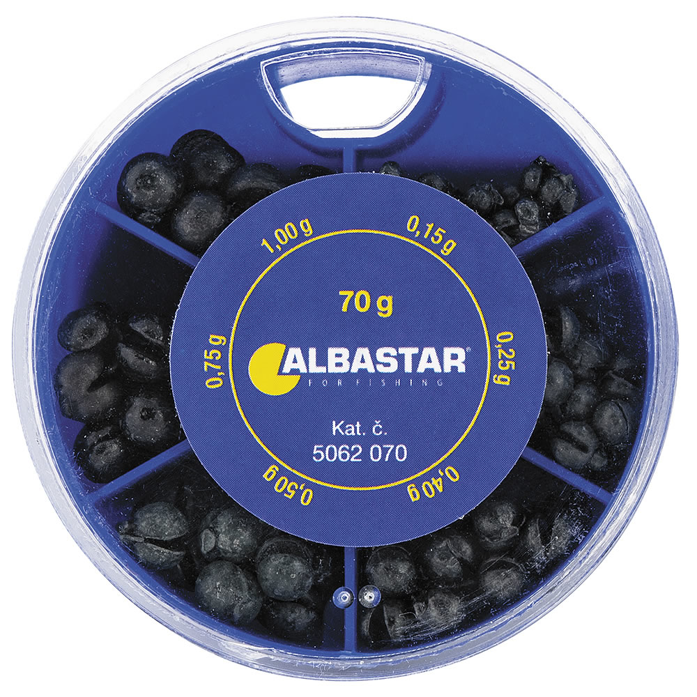 Sada jemných dělených olověných broků v praktické krabičce na plavanou.