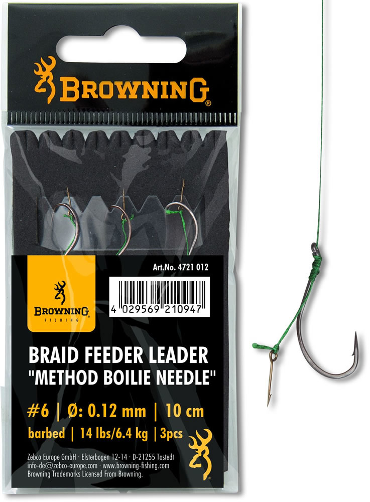 Krátké method feederové návazce na superměkké pletené šňůře. S boilie jehlou na vlasu pro jednoduché nastražení s mimořádně pevným Mustad háčkem.