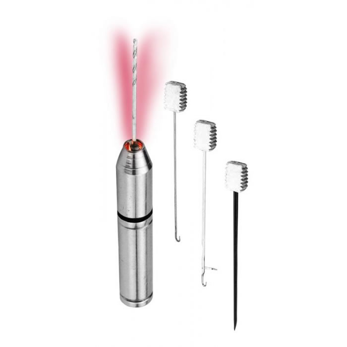Nerezový set obsahující sadu tří různých jehel a vrtáčku. Rukojeť je vybavena diodou pro osvětlení napichované nástrahy při nočním rybolovu.