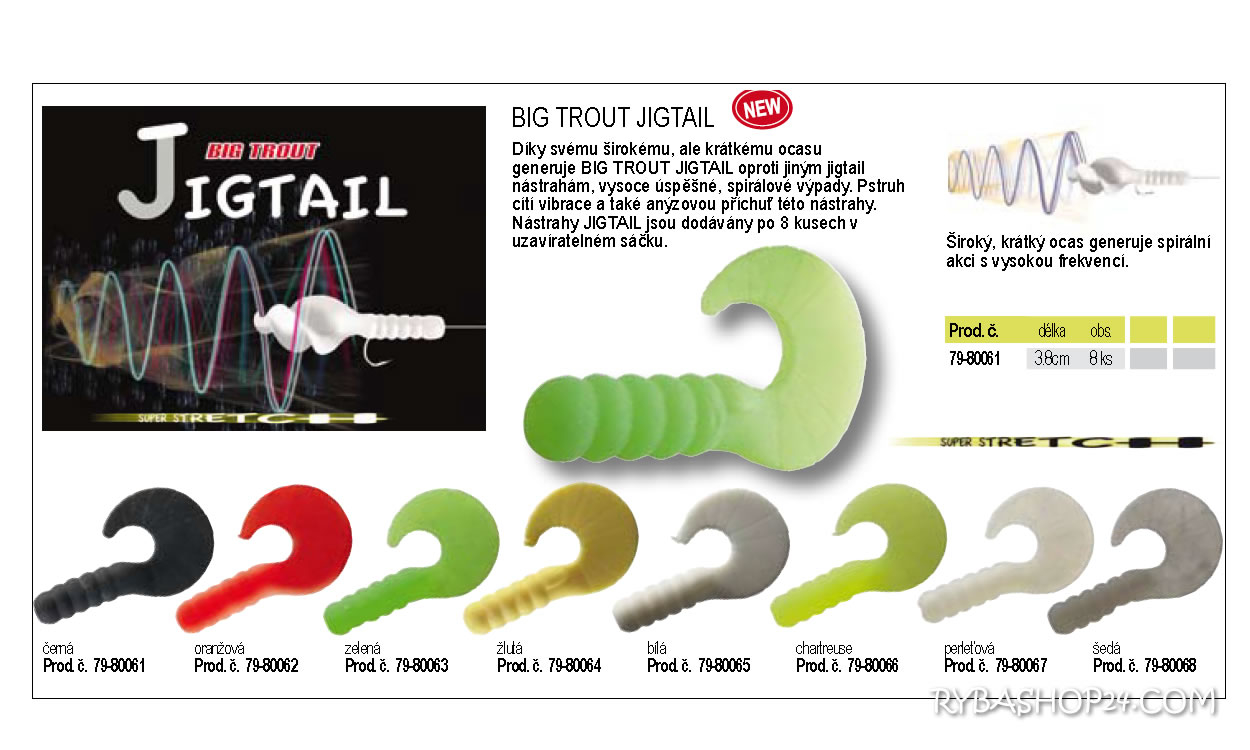 Díky svému širokému, ale krátkému ocasu generuje BIG TROUT JIGTAIL oproti jiným jigtail nástrahám, vysoce úspěšné, spirálové výpady. Balení: 8ks.