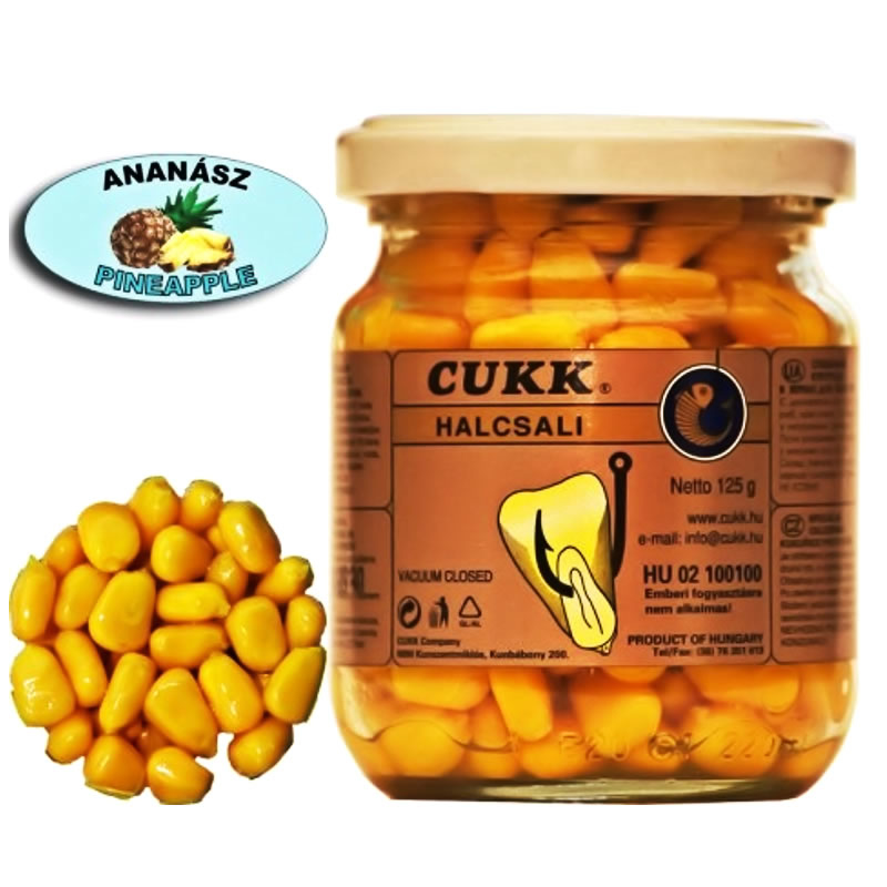 Výběrová nakládaná kukuřice bez nálevu, barvená. Různé druhy speciální kukuřice pro lov kaprovitých ryb. Velmi dobře drží na háčku, při napichování nepraská. Tvrdost a odolnost zrnek proti háčkům jsou ideální. Po otevření a pečlivém opětovném uzavření je lze používat nepřetržitě měsíce bez rizika znehodnocení.