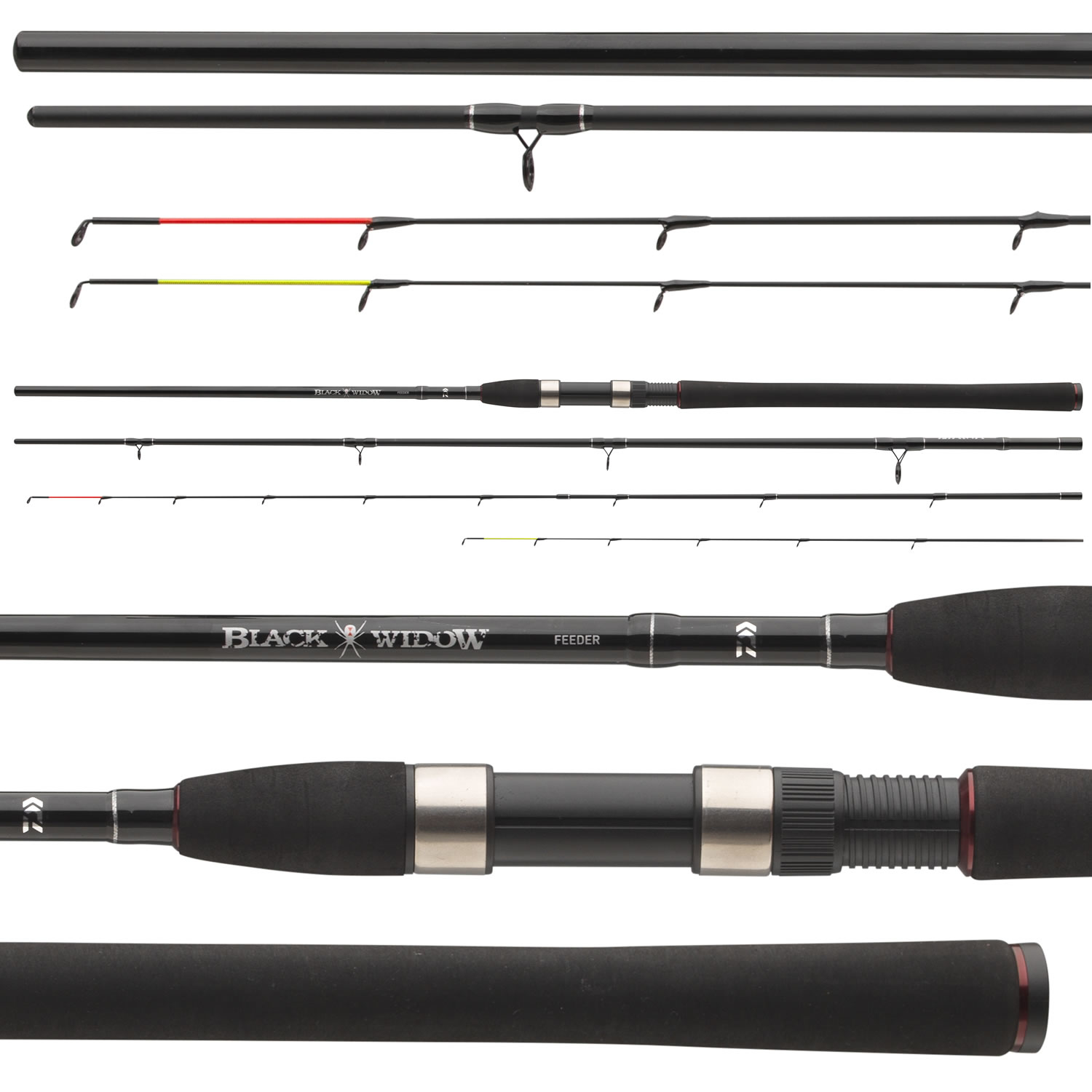 Feederová řada Black Widow Feeder od společnosti DAIWA nabízí širokou škálu moderních feederových prutů se senzačním poměrem cena/výkon. Lehké feederové pruty s vrhací zátěží 60g, 80g a 100g jsou vyladěny podle speciálních požadavků moderních feederových rybářů. Těžší pruty s vrhací zátěží 120g a 150g a silnou páteří disponují většími očky na špičce, což umožňuje snadné použití šokových návazců. Perfektní, když potřebujete dopravit větší množství krmení na vzdálená místa. Pruty mají rukojeť z prémiové smršťovačky, která zajišťuje mimořádně příjemnou manipulaci a v případě potřeby se dá snadno vyčistit. Feederové pruty Black Widow Feeder jsou osazeny očky z oxidu titanu a dodávají se s jednou červenou a jednou žlutou feederovou špičkou.