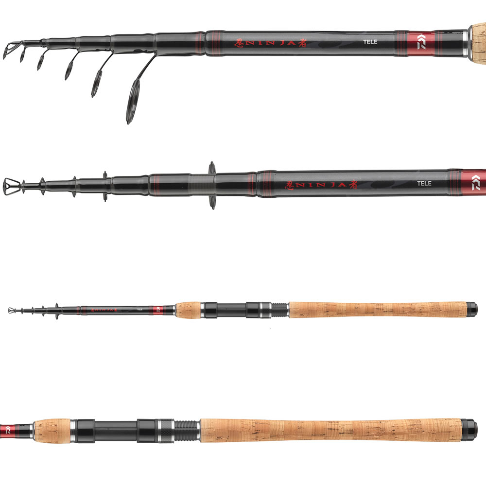 S pruty Ninja X Tele nabízí DAIWA širokou škálu univerzálních teleskopických prutů s krátkými díly. Pruty z řady Ninja X Tele se svými blanky z prémiových uhlíkových vláken a vázanými očky vykazují akci blízkou akci dělených prutů – rychlé akce s rychlým návratem do původní polohy umožňují přesné náhozy a dobrou kontrolu nástrahy při vláčení. Pevné špičky z uhlíkových vláken jsou extrémně odolné a dokonale ladí s harmonickou akcí blanků. Tyto teleskopické pruty umožňují při vláčení cítit kontrolu nad nástrahou, kterou lze jen těžko odlišit od dělených prutů. Silná páteř se špičkovou akcí spolehlivě absorbuje klepání hlavou velkých ryb a poskytuje jistotu při zdolávání. Ninja X Tele se samozřejmě velmi dobře hodí i pro lov na plavanou téměř všech našich sladkovodních ryb. S pruty Ninja X Tele získáte prémiové dobře vyvážené lehké teleskopické pruty za senzační cenu.