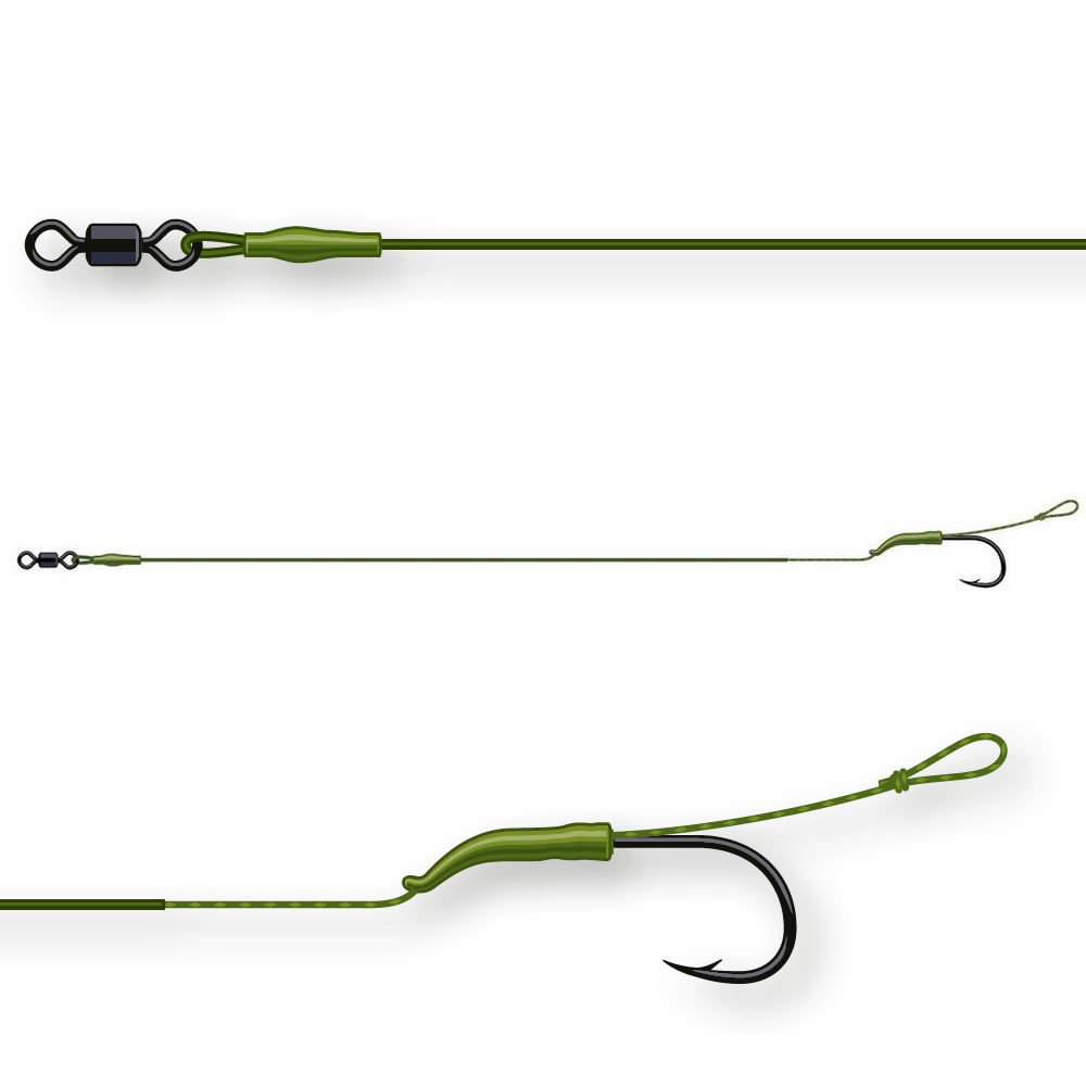 Návazec, který se v průběhu let stal osudný mnoha velkým kaprům. Tuhá část potaženého návazcového materiálu ztěžuje kaprům vyplivnout nástrahu/háček.