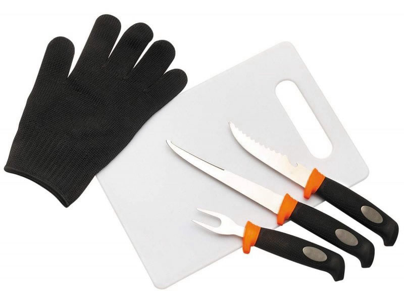 Filetovací sada obsahuje 2 kvalitní filetovací nože z nerezové oceli se střenkami z ABS materiálu, vidličku, plastové prkénko a rukavici odolnou proti proříznutí.