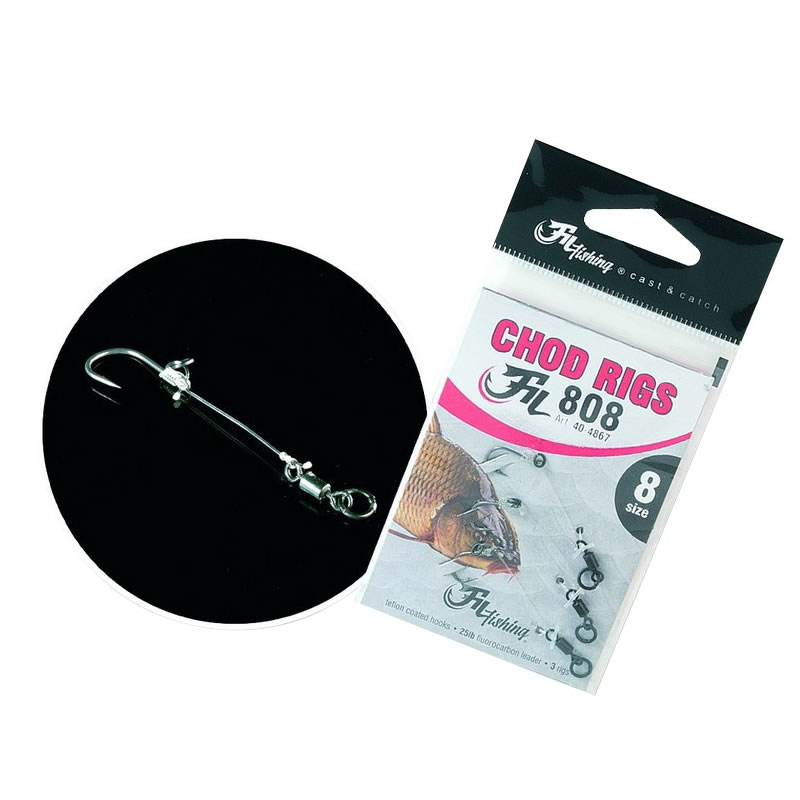 Rybaření s universálním návazcovým systémem Chod Rig je jednoduše senzací. Ručně vázaný kvalitní návazec na Fluorocarbonu nosností 25 lb ( 11,34 kg ), který je osazen kvalitními háčky. Je to všestranný hotový návazec, který je ideální pro všechny typy vod. Ať už to jsou různá jezera, rybníky, nebo dokonce řeky. Chod Rig je stal skutečnou celebritou mezi ostatními kompletními návazci.
