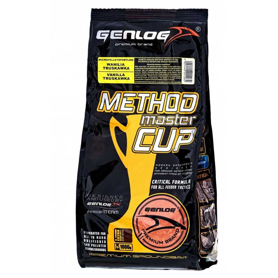 Method Master Cup Genlog návnada je inovativní a jedinečná kombinace mikro pelet a výživné návnady. Tajemstvím této směsi je pečlivě zvolený poměr mikrogranulí a vybraných složek potravin, které této směsi dodávají specifické atraktivní vlastnosti. Tato nástraha nastavuje nové standardy pro lov při dně a dokonale splňuje očekávání trhu. Tuto směs lze použít jak pro method krmítka, tak pro běžná krmítka. Nespornou výhodou této směsi je atraktivita její chuti. Používaná aromata a zvýrazňovače chuti silně povzbuzují ryby k jídlu.