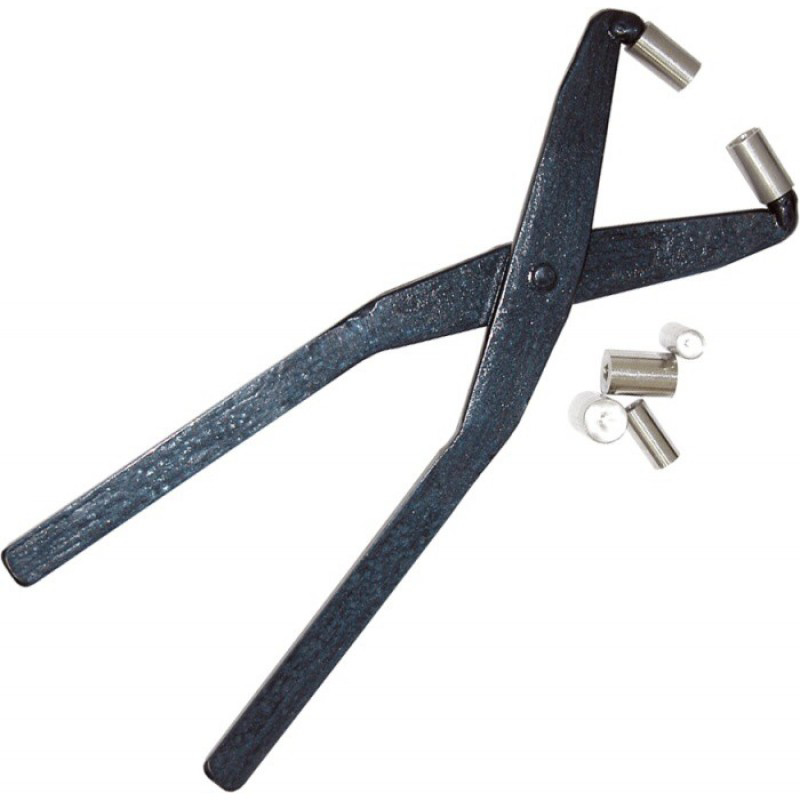 Kovové kleště na výrobu kuliček z rohlíku, dodávané s třemi velikostmi čelistí.