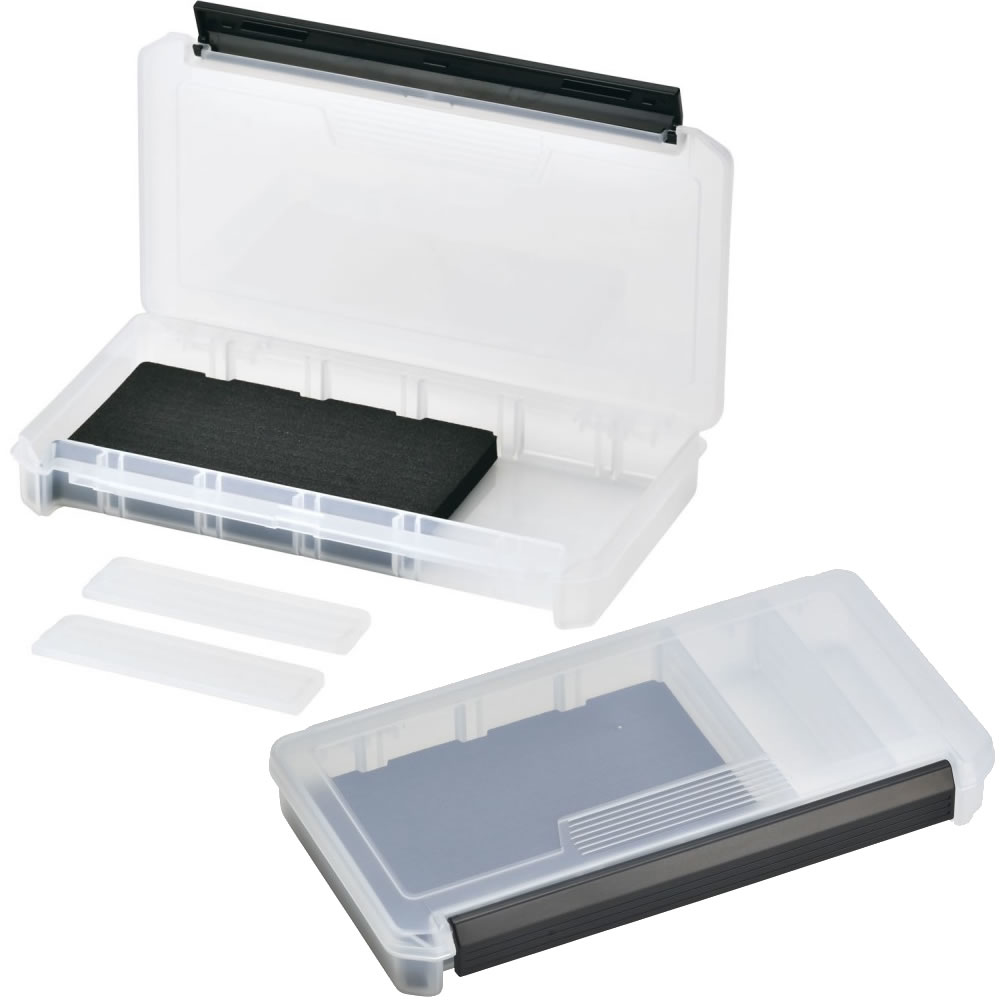 Uvnitř této krabičky je dvojí variabilní regál a polyetylén pěna s drážkami pro snadné uskladnění umělých návnad.