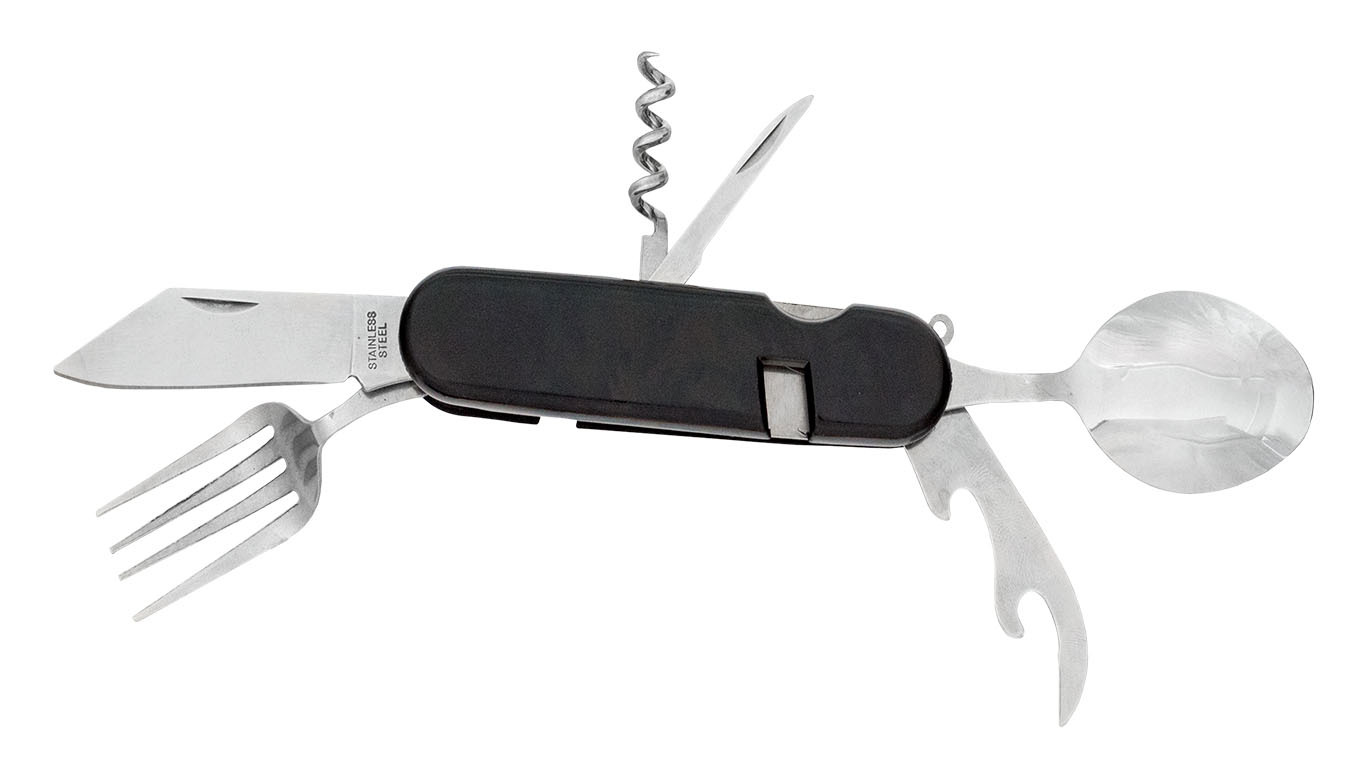Ideální společník pro pobyt v přírodě a stravování u vody. Tento rozkládací nástroj v sobě ukrývá nůž, vidličku, lžíci, otvírák na konzervy a vývrtku. Díky možnosti rozdělení na dvě části jej lze používat jako plnohodnotný příbor.