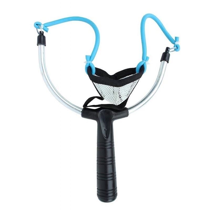 Zakrmovací kovový prak s plastovým držadlem, kvalitním košíčkem a náhradními pásky na gumu.