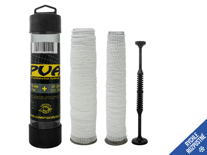 Kompletní sada PVA systému pro efektivní vnadění. Balení obsahuje dva tubusy s navlečenou punčochou (průměry 25 mm a 35 mm, délka 7 m každá) a oboustranné pěchovadlo.