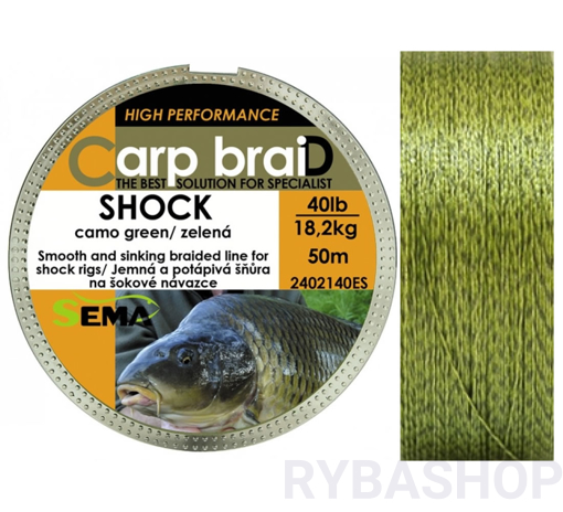 Šok je velmi jemná, potápivá šňůra v camo zelené barvě na plochu šokových návazců. Na kmenový vlasec navažte Shock v rychlosti dvou délek prutu. Docílíte tedy pak delších odhozů.