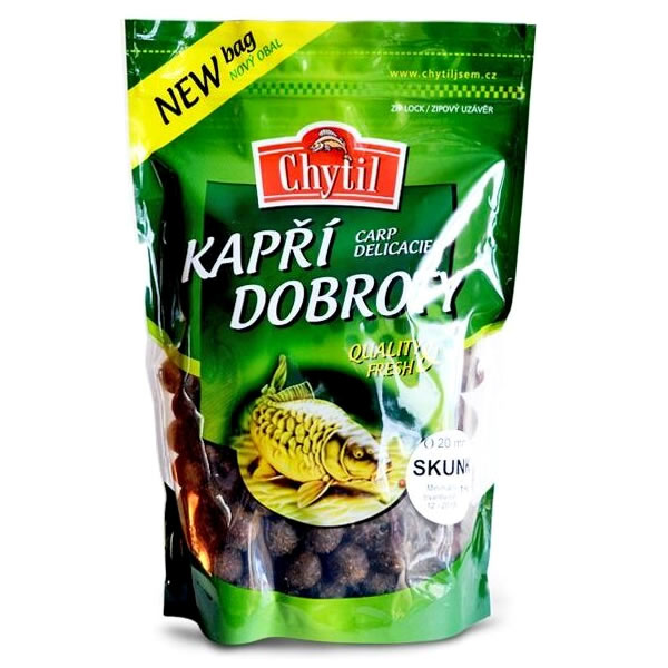 Boilies postavené na rybích moučkách, mléčných proteinech a zcela nových druzích koření (papričky Naga Bih Jolokia, Kardamon a dalších). Do směsi se přidává pouze čistá tekutá potrava Skunk Shit bez dalších esencí a přídavků. Vzniká z toho tedy další funkční boilies bez obsahu esencí, společně s Červeným Rambem. Podařilo se nám docílit jedinečně ostré chuti a jemné vůně, na kterou podle letitých zkušeností reagují kapři velmi rychle. Hledáte něco, s čím si chcete počkat na velkého kapra a vyhnout se atakům menších ryb? Volte Skunka! Nijak neupravená a NEdipovaná kulička je selektivní, ale zároveň efektivní na lov velkých ryb. Skvěle funguje na velkých vodních plochách, jezerech a také řekách