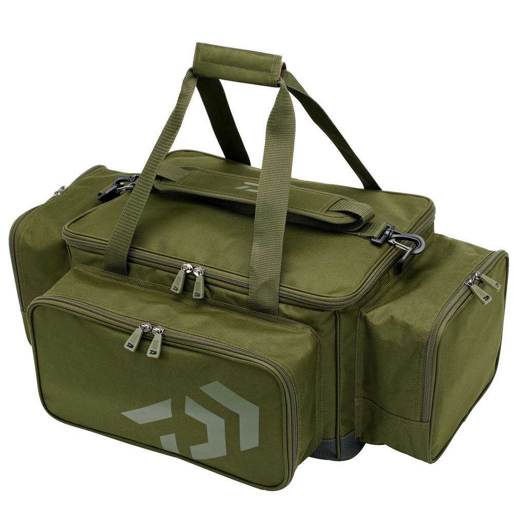 Tato velká víceúčelová taška nabízí spoustu úložného prostoru pro příslušenství, oblečení atd. Se dvěma velkými kapsami na obou stranách a extra velkou přední kapsou na vidličky, indikátory záběru atd. Dno z PVC zabraňuje pronikání vlhkosti od země. Taška je navržena tak, aby se dala snadno uložit pod kaprové lehátko. Polstrovaný ramenní popruh pro pohodlné přenášení.