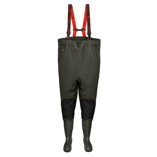 Wathose aus hochwertigem, verstärktem Polyestergewebe. Zusätzlich ausgestattet mit einer Dokumententasche und Verstärkungen an den Knien. Die Stiefel wurden mit einer Profilsohle ausgestattet, die auch auf rutschigem Untergrund für ausreichend Stabilität sorgt.