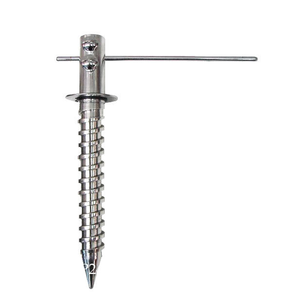 Der Bohrer dient der Stabilität des gesamten Systems. Bohren Sie den Bohrer in den Boden, indem Sie Druck auf das beiliegende Holz ausüben. Setzen Sie dann den unteren Teil des Regenschirms ein und befestigen Sie ihn mit zwei Schrauben.