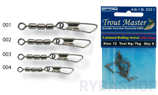 Trojitý pevnostní obratlík s karabinkou proti zamotání vlasce při lovu pstruhů.