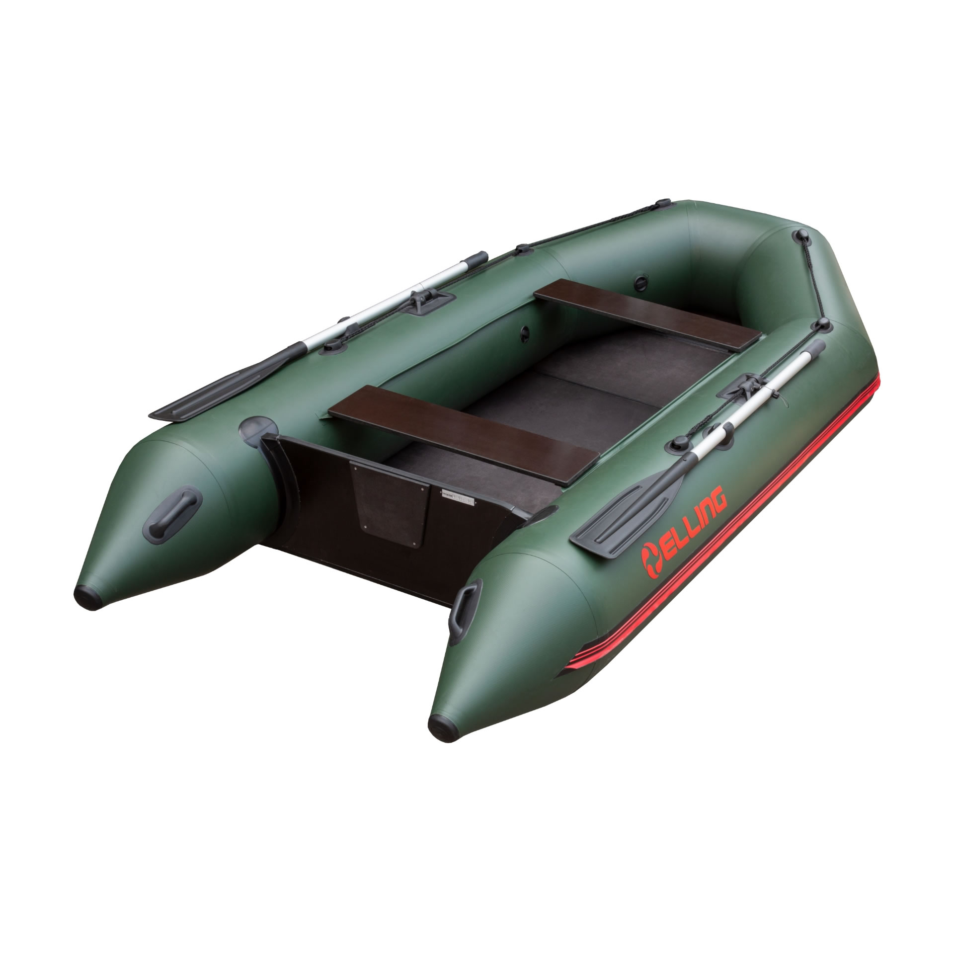 The Elling Forsage 270 in green is designed for anglers seeking the perfect balance of low weight and interior space. Made from high-quality PVC with welded seams for superior strength. It features a solid folding floor (accordion type) that provides stability without sagging. Side abrasion strips and three ergonomic handles ensure easy handling and transport.