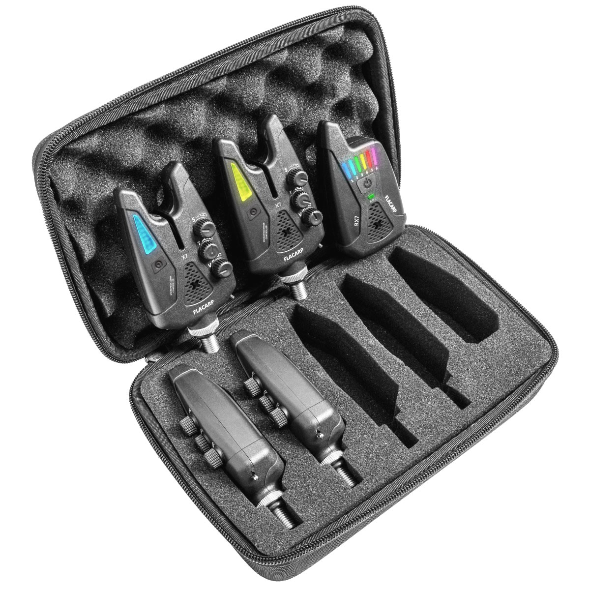 The flagship FLACARP X7 4+1 set is the most comprehensive kit for anglers utilizing the maximum number of rods. X7 alarms feature a top-tier sensor resolving line movement from 1.5mm and adjustable RGB LED colors. The RX7 receiver evaluates bites with surgical precision, including direction and speed. This set is synonymous with extreme mechanical durability and worry-free AAA battery power.