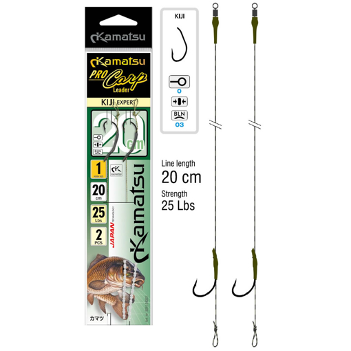 Special leaders designed particularly for carp fishing with the hair rig method. It was tested in many carp fisheries across Europe and performed well in all conditions. The 25lbs sinking line is equipped with a Kamatsu Kiji 5153 carp hook and a Kamatsu power swivel.