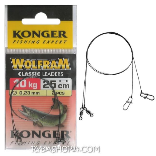Kvalitní wolframové lanko na dravce s obratlíkem a bezpečnostním závěsem. Lanko je velmi jemné a mimořádně odolné.