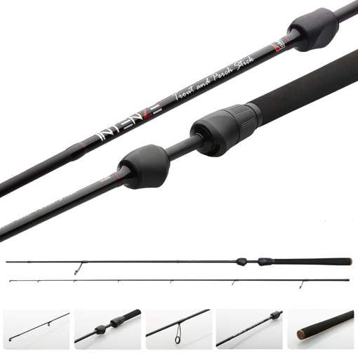 Les cannes fines Intenze Trout et Perch sont conçues pour la pêche à la truite et à la perche. Ils sont spécialement conçus pour pêcher avec de petits leurres, mais ils peuvent également être utilisés pour pêcher avec d'autres petits leurres, comme ceux en caoutchouc.